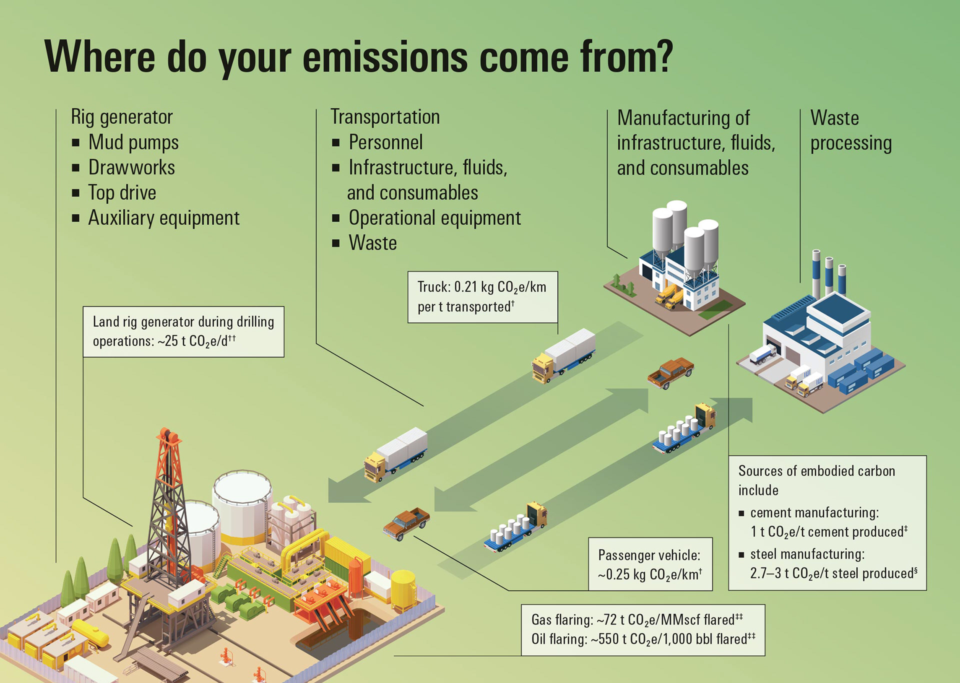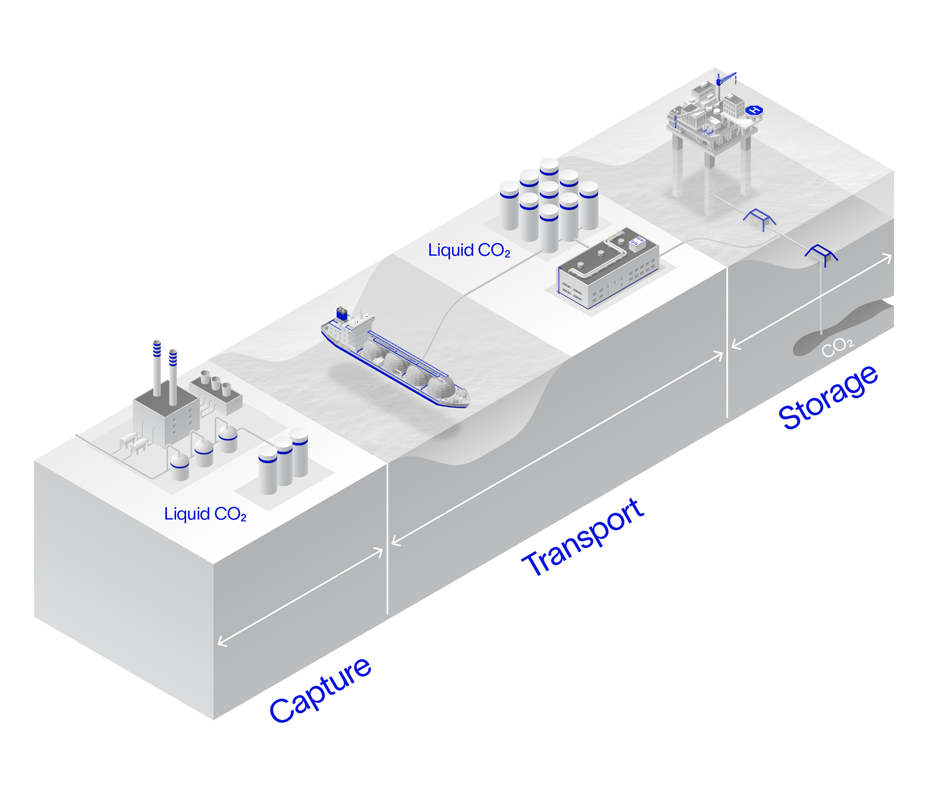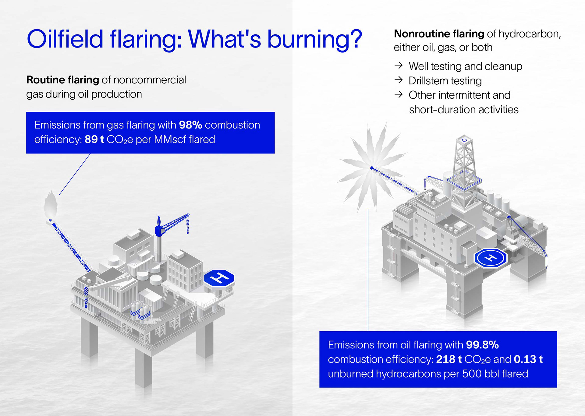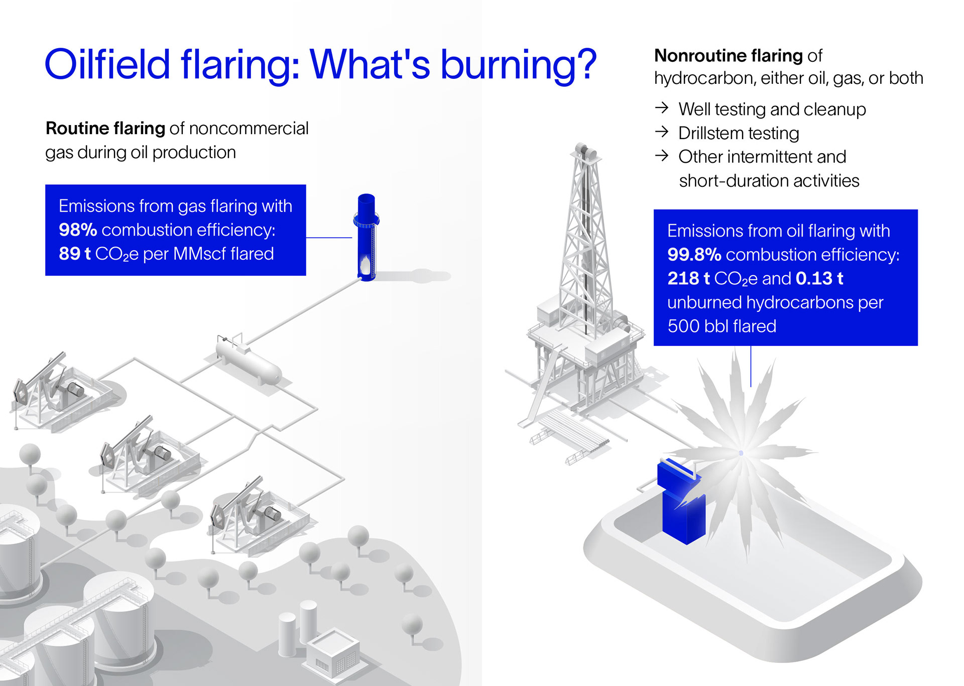 Series of 2D isometric sustainability illustrations for Schlumberger (SLB) before and after rebranding. Flaring, emissions, carbon capture.